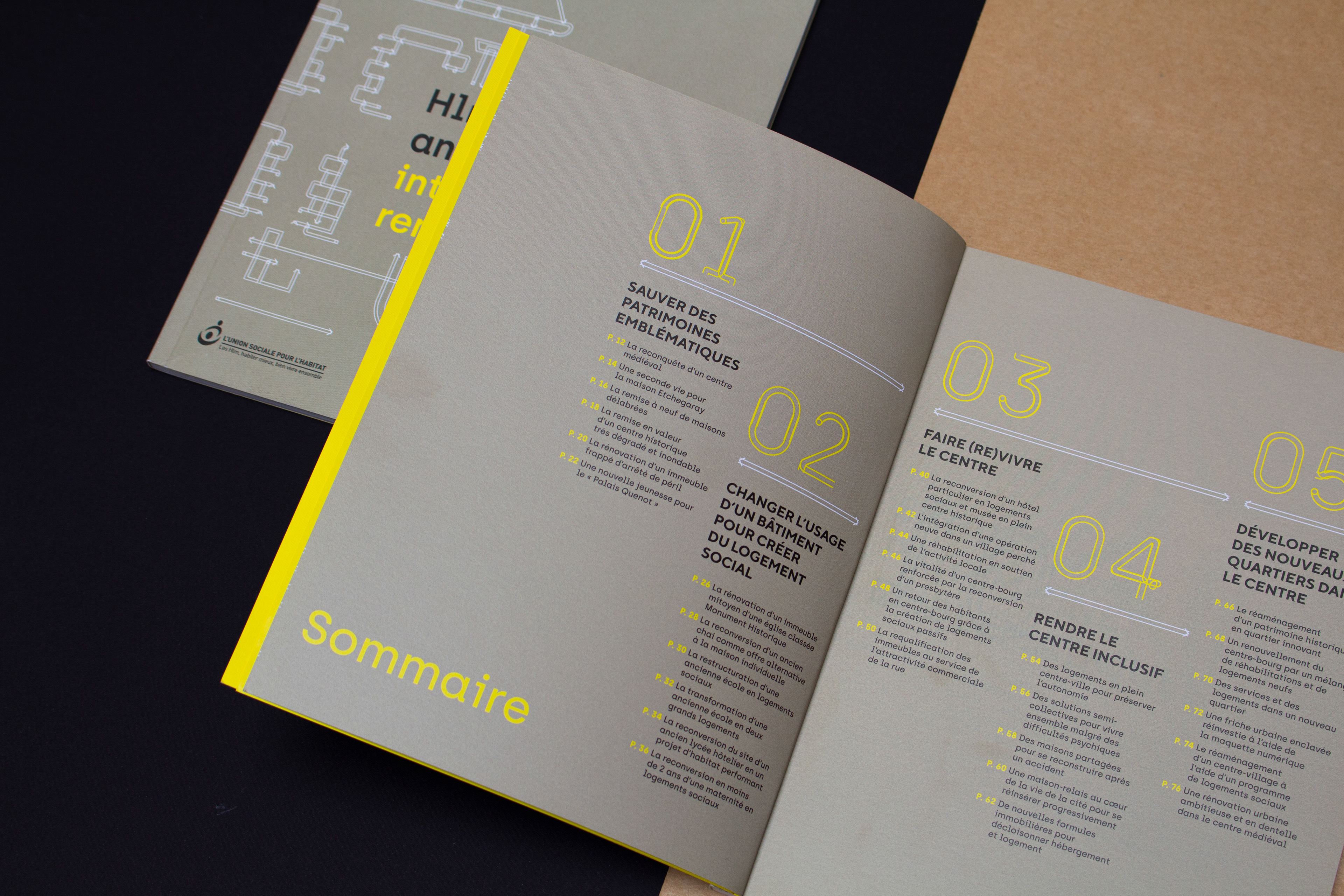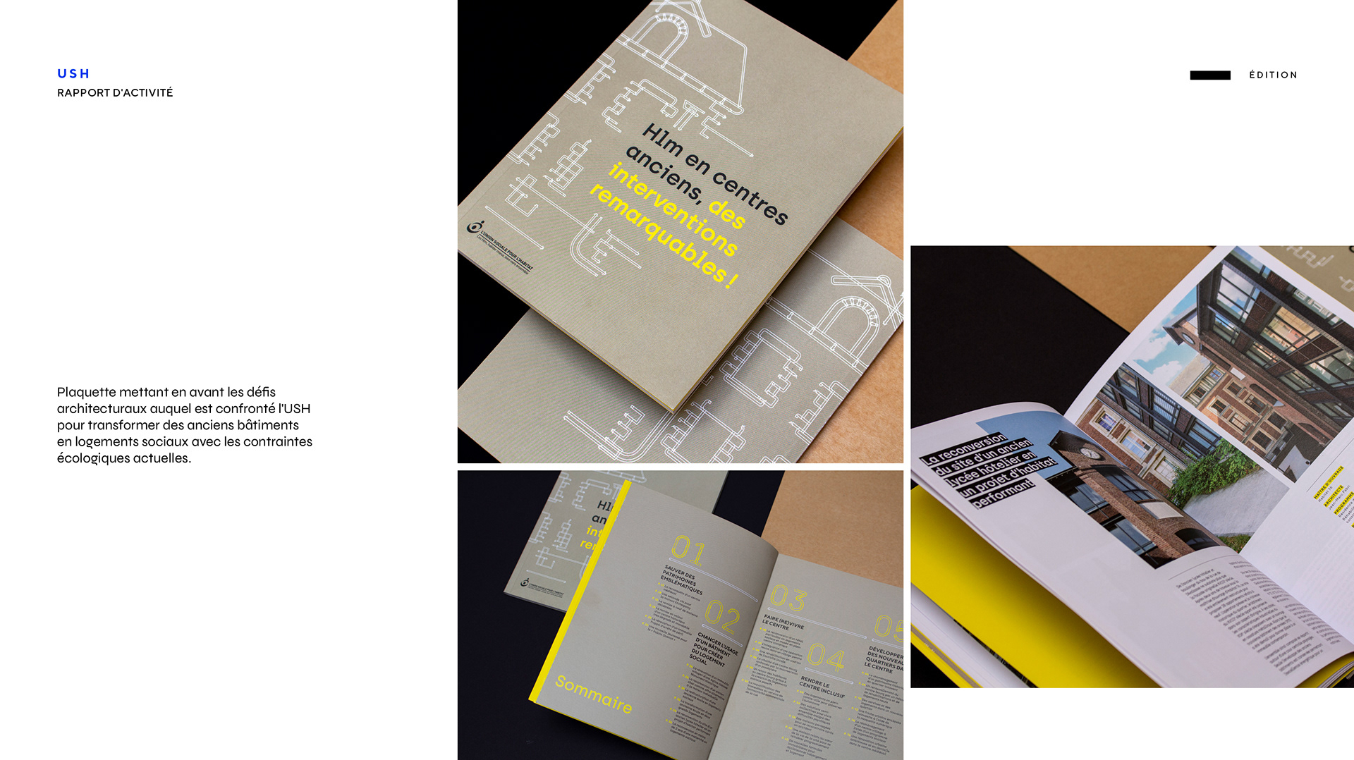 Plaquette mettant en avant les défis architecturaux auquel est confronté l'Union Sociale pour l'Habitat pour transformer des anciens bâtiments en logements sociaux avec les contraintes écologiques actuelles.